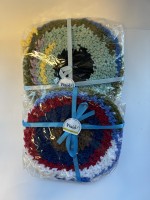 Zelfgebreide pannenlappen. De lappen hebben een fijne dikte doordat zij uit twee lagen bestaan.