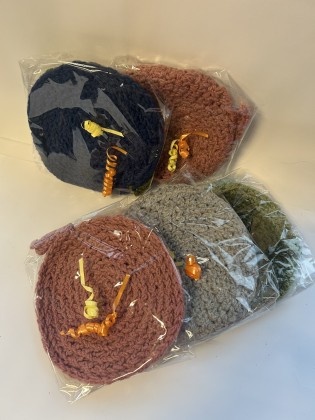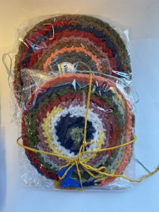 Zelfgebreide pannenlappen. De lappen hebben een fijne dikte doordat zij uit twee lagen bestaan.
