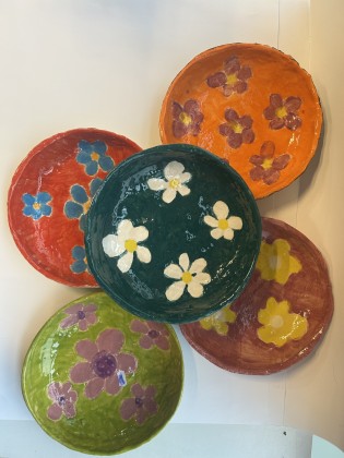 Vrolijke schalen met bloemen. In diverse kleuren.