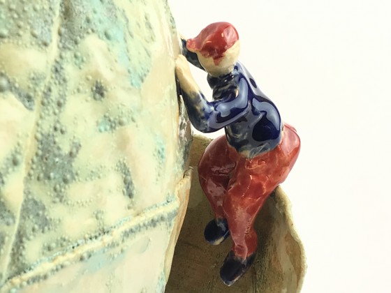 Turquoise vaas met een grappig zittend figuurtje aan de zijkant.
