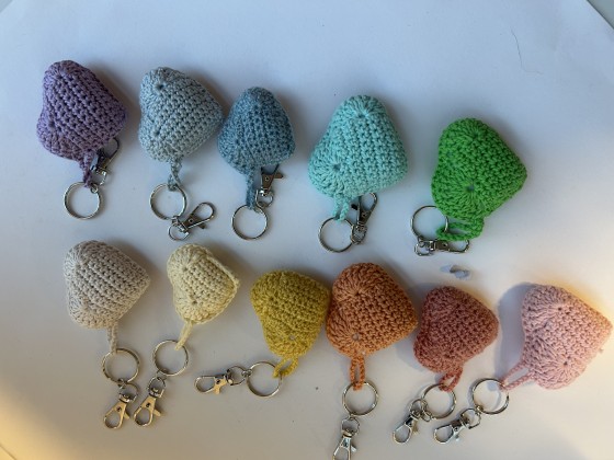 Gehaakte sleutelhangers in hartvorm. Beschikbaar in vele kleuren. We hebben van iedere kleur 1 op voorraad.