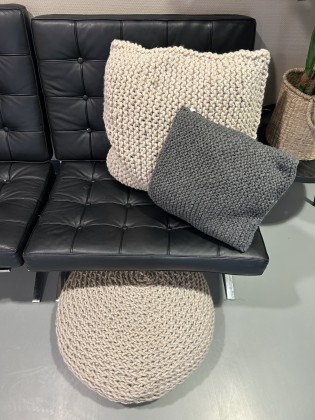 Gebreide poef/voetenbankje van stevige stof. De poef heeft een afmeting van Wilt u hier een bijpassende kussen bij?