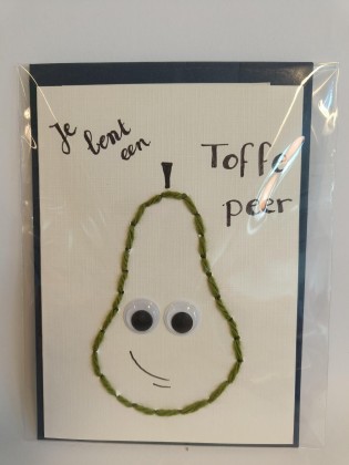 Een vrolijke kaart met de tekst: Je bent een toffe peer! Let op: elke kaart wordt met de hand gemaakt en zijn daardoor uniek. De kleuren en details kunnen wat afwijken van de afbeelding die online wordt weergegeven.