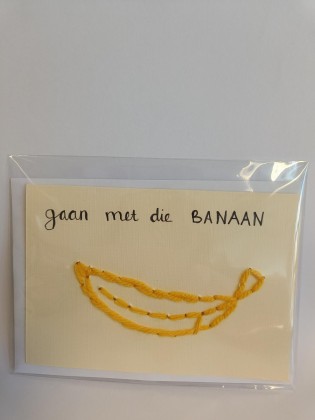 Een vrolijke kaart met de tekst: Gaan met die banaan! Let op: elke kaart wordt met de hand gemaakt en zijn daardoor uniek. De kleuren en details kunnen wat afwijken van de afbeelding die online wordt weergegeven.